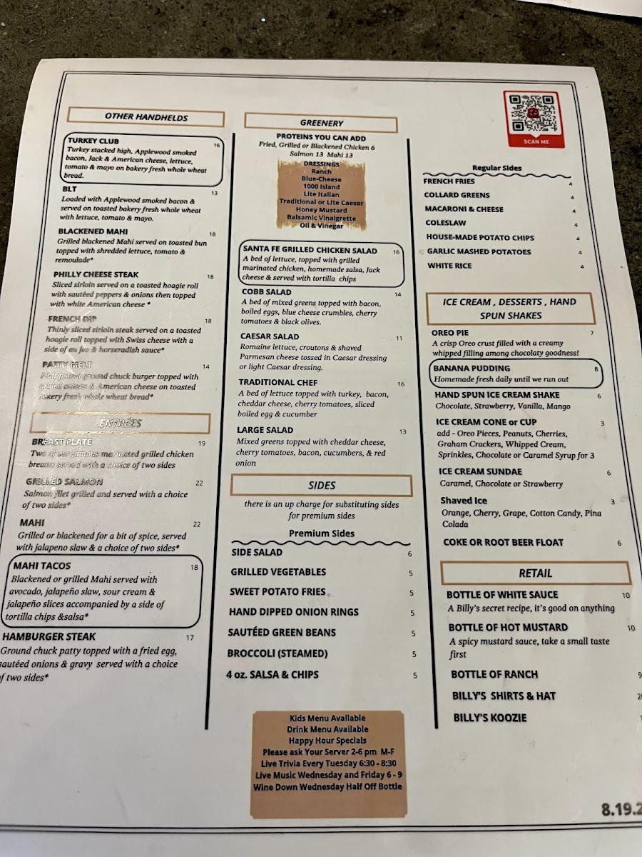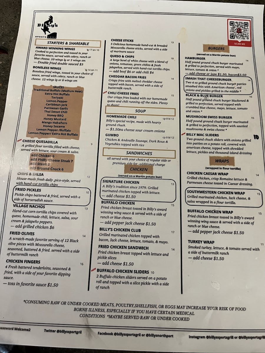 Billy's Sports Grill Menu